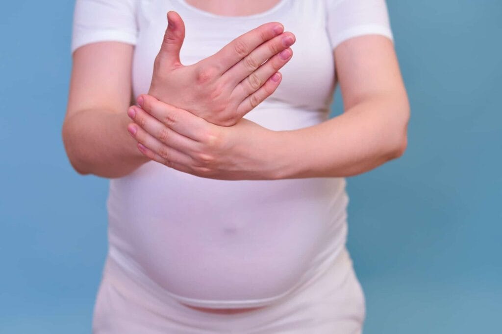 Many pregnant women experience carpal tunnel syndrome in pregnancy, which happens when swelling in the wrist puts pressure on a nerve. This pressure can lead to numbness, tingling, or pain in the hands.